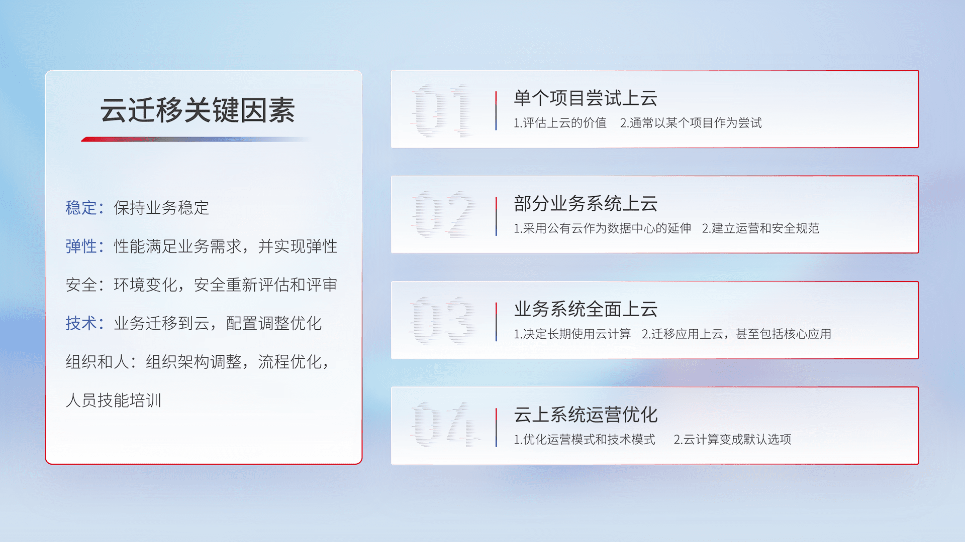 结合实际业务,,从规划设计、、、、云平台选型、、云原生改造、、、、数据迁移、、集成交付,,,,迁移全过程为客户识别最佳上云路径,,,,做好风险识别管理,,,设计网络架构、、身份权限、、安全审计合规、、操作审计、、日志审计、、、监控告警策略、、多站点容灾设计等,,,对云上基础设施进行整体规划,,,,提升IT治理水平,,,,以满足弹性、、高可用、、、高性能的需求。。。。