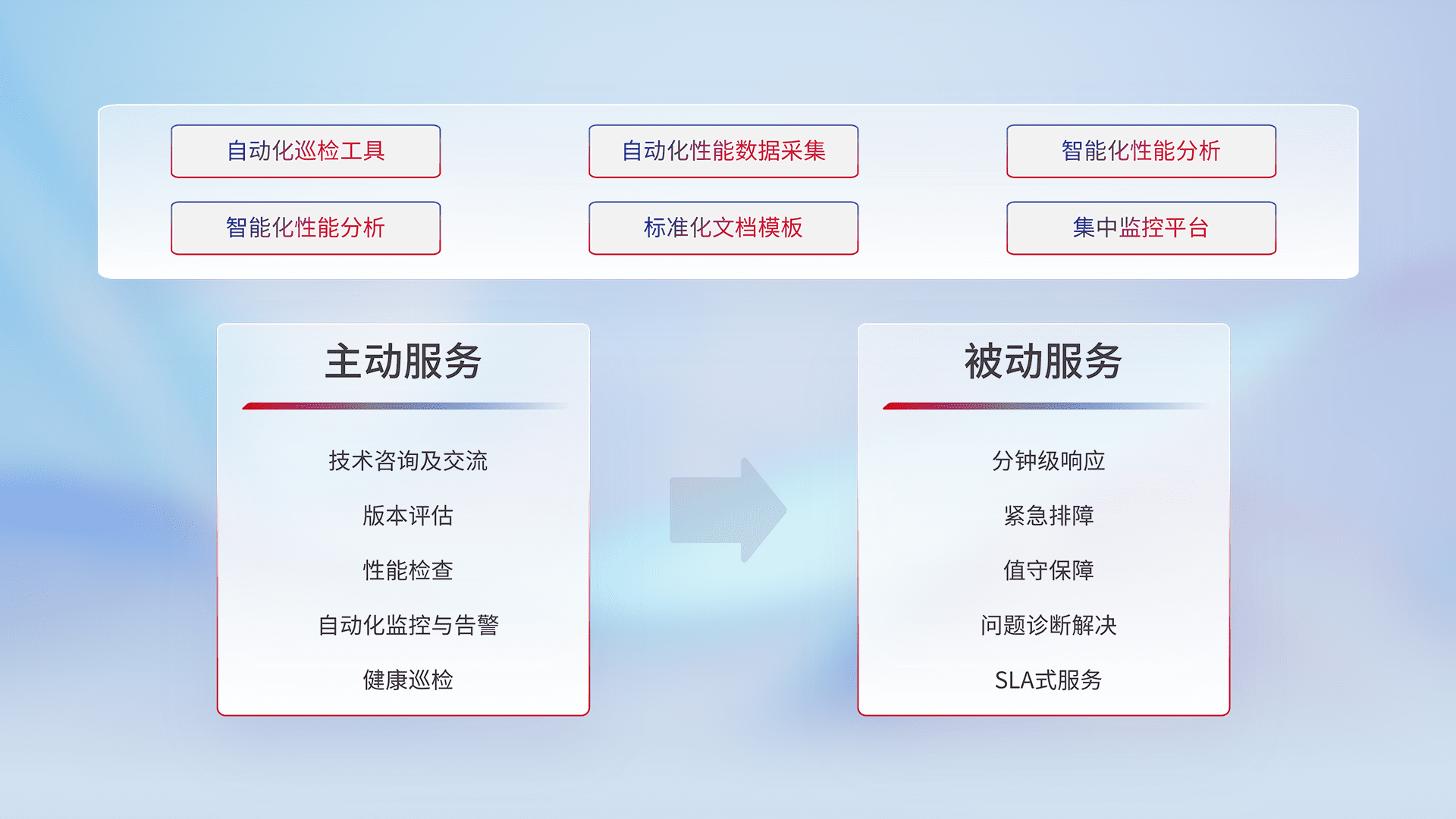 智能化工具和标准化文档,,保障服务质量,,,,提供主动服务(包含技术咨询、、、版本评估、、、性能检查、、、、自动化监控与告警、、健康巡检)和被动服务包含(分钟级响应、、、紧急排障、、、、值守保障、、、、问题诊断解决、、SLA服务)。。。